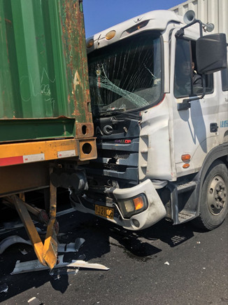 上圖為事故車輛 當(dāng)天中午,在副站崗?fù)づ哉镜墓ぷ魅藛T發(fā)現(xiàn)該所前方出口不遠(yuǎn)處有貨車停在那里不動(dòng),以致后面車輛無法通行。工作人員隨即跑到前方查看情況,原來是三輛貨車發(fā)生追尾,其中有一輛車車頭被撞得凹陷,擋風(fēng)玻璃也被撞碎,在了解事故現(xiàn)場無人員受傷后,工作人員馬上向監(jiān)控中心匯報(bào)情況。由于事故車輛較大面積滯留,導(dǎo)致后方車子堵到主線上,一些不明情況的駕駛員在車?yán)锸箘虐蠢却叽?,現(xiàn)場充滿焦躁情緒。 如何盡快疏通道路?正在食堂吃飯的一班班長潘慶耀放下碗筷跑到事故現(xiàn)場,同工作人員叫前面受損較少的事故車輛先把車子開出收費(fèi)站,再讓第三輛受損嚴(yán)重的車子試著發(fā)動(dòng)車子開出去,所幸三輛車子都能開離車道。在將地上的破損碎片清理到車道兩旁后,工作人員繼續(xù)指揮車輛向前行駛,收費(fèi)內(nèi)廣場在較短時(shí)間內(nèi)恢復(fù)了正常通行。 沈芬芳