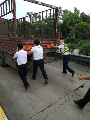 2018年5月27日,這本來(lái)是平凡普通的一天,可因?yàn)檫@件事,變成了不一樣的一天。 這一天,溫嶺西高速路收費(fèi)員洪燈杰像往常一樣,在一號(hào)超寬車道旁的收費(fèi)亭里工作。一輛綠色汽車剛走不久,卻發(fā)現(xiàn)后面一輛12軸型的小貨車停在那里,一動(dòng)不動(dòng)。洪燈杰心生疑惑,于是趕緊走出收費(fèi)亭,到小貨車跟前查看。原來(lái),這輛車剛走到收費(fèi)站面前,便耗盡了電量,發(fā)動(dòng)不了了。正在司機(jī)焦頭爛額之時(shí),班長(zhǎng)湯明漲和其他收費(fèi)員吃飯回來(lái),看見(jiàn)了這一幕。 湯明漲簡(jiǎn)單地詢問(wèn)了洪燈杰事情的經(jīng)過(guò),本來(lái)準(zhǔn)備等拖車,可是現(xiàn)在正是中午車輛高峰期,加上五號(hào)車道在施工,等拖車不合適。如果導(dǎo)致一號(hào)車道堵車,切換成ETC也緩解不了??紤]到這些問(wèn)題之后,湯班長(zhǎng)決定叫來(lái)幾個(gè)“大力士”,幫忙推車。