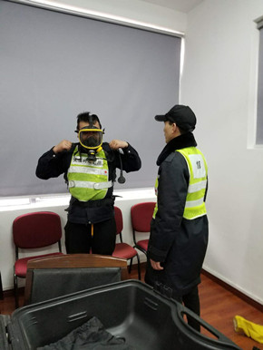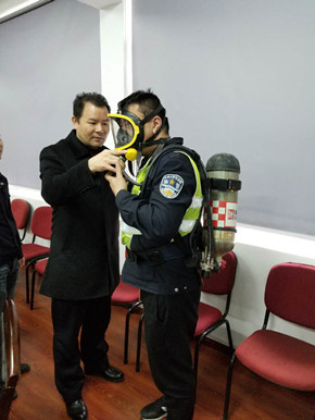 培訓中,陶文輝講解了“高速隧道火災特點”及呼吸器、防化服的使用方法及相關要求。話題開啟后,隊員們紛紛參與討論,爭相發(fā)言,講述各自在隧道事故處理中施救和應對的經(jīng)歷與心得,交流平日巡查中所需注意的事項,互相提醒工作中的不足,并針對實際問題提出了許多建設性意見。同時,在主講人的現(xiàn)場演示下,參訓人員逐個“以身試法”,進一步熟悉和掌握了防毒面罩的穿戴方法。