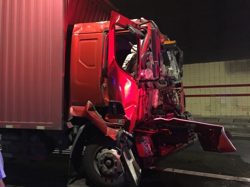 圖為事故車(chē)輛 接警后,執(zhí)勤隊(duì)員立即奔赴現(xiàn)場(chǎng),做好車(chē)輛預(yù)警工作?,F(xiàn)場(chǎng)兩輛廂式貨車(chē)停在慢車(chē)道上,后貨車(chē)的副駕駛室被擠壓得嚴(yán)重變形,幸好副駕駛位置無(wú)人,否則后果不堪設(shè)想。受傷的司機(jī)坐在電纜溝上,右手臂一直流血,意識(shí)清醒。見(jiàn)司機(jī)受傷,隊(duì)長(zhǎng)通知中控員撥打救護(hù)車(chē)。前車(chē)已經(jīng)停在電纜溝上,但是車(chē)輛不能移動(dòng),隊(duì)員們向司機(jī)詢問(wèn)之后才了解,前車(chē)漏機(jī)油,兩車(chē)都需要拖車(chē)。隊(duì)員們一邊在隧道內(nèi)疏通交通一邊在等候救護(hù)車(chē)和拖車(chē),16:26分,救護(hù)車(chē)到達(dá)現(xiàn)場(chǎng)將受傷司機(jī)帶走,17:50分,拖車(chē)將兩輛事故貨車(chē)拖離,現(xiàn)場(chǎng)恢復(fù)通車(chē)。該起事故造成隧道內(nèi)車(chē)輛緩行兩個(gè)小時(shí),期間封道十多分鐘,事故原因是前車(chē)有故障緩慢行駛,因無(wú)任何警示標(biāo)志,后車(chē)沒(méi)有注意而造成追尾。 在此提醒各位司機(jī)朋友,由于隧道內(nèi)外亮度不同,進(jìn)入隧道請(qǐng)?zhí)崆伴_(kāi)燈減速慢行,在行車(chē)過(guò)程中要注意前面路況,發(fā)現(xiàn)有問(wèn)題及時(shí)減速慢行,并保持安全車(chē)距。如遇突發(fā)狀況,車(chē)子無(wú)法正常行駛時(shí),為了自已和他人的安全,請(qǐng)及時(shí)報(bào)警并做好相應(yīng)警示標(biāo)志,防止二次事故的發(fā)生。 陳旦平
