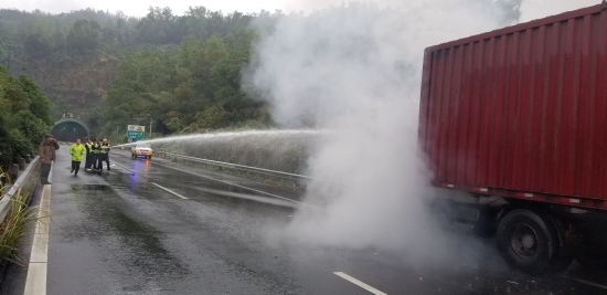 隧道外突發(fā)火情,執(zhí)勤隊(duì)火速救援 11月23日上午09:15分,一陣急促的警鈴聲響起,大溪嶺北情報(bào)板附近硬路肩有一集裝箱貨車車頭起火,執(zhí)勤三隊(duì)隊(duì)長剛好在中控室,迅速組織執(zhí)勤隊(duì)員趕往現(xiàn)場。