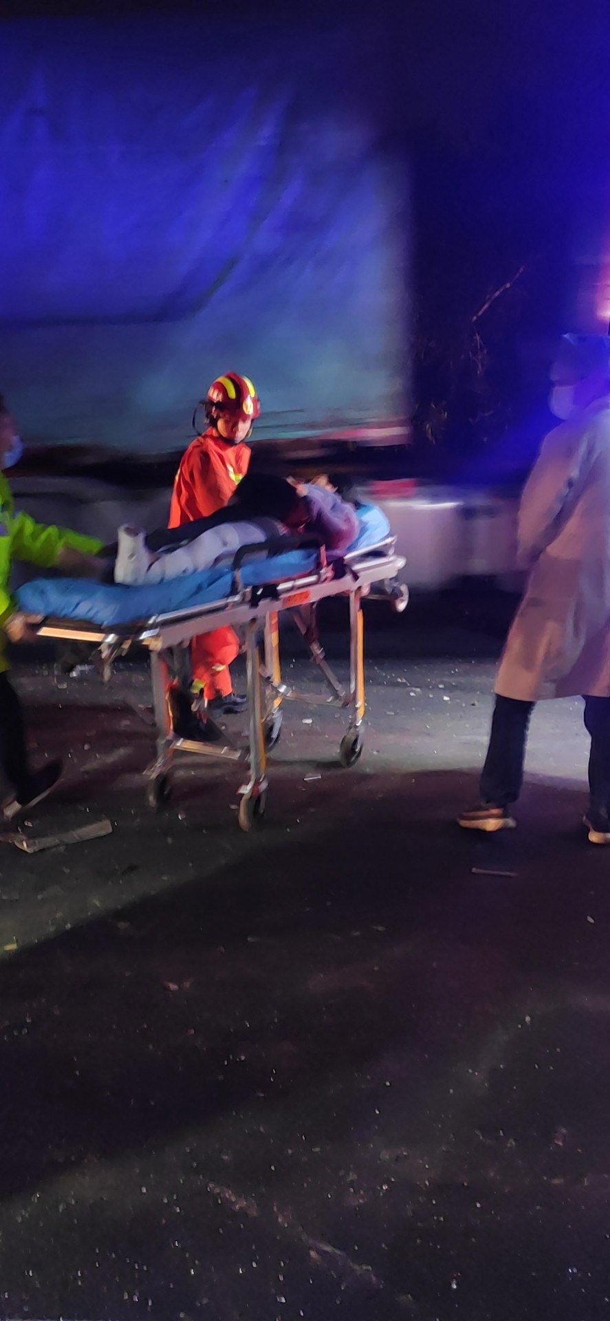 21:50巡邏車和消防車同時(shí)到達(dá)現(xiàn)場(chǎng),隊(duì)員陳幸飛快的跑下來(lái),以百米沖刺的速度做好巡邏車的安全措施和預(yù)警工作,有3人受傷,事故車頭已嚴(yán)重變形,一名女性腰部受傷坐在地上,語(yǔ)速正常,思維清晰。還有二名人員被卡在駕駛室,消防隊(duì)員正在查看現(xiàn)場(chǎng)準(zhǔn)備施救,受傷人員哭爹喊娘嚎聲不斷,由于救護(hù)車還沒(méi)達(dá)到現(xiàn)場(chǎng),陳幸在事故車后方硬路肩上維護(hù)秩序,防止車輛占道,并同時(shí)迎接救護(hù)車,湯寧光則在維護(hù)現(xiàn)場(chǎng)秩序,阻止其他司機(jī)圍觀影響救援。 22:00第一輛救護(hù)車到達(dá)。醫(yī)護(hù)人員準(zhǔn)備擔(dān)架,另一名醫(yī)生去詢問(wèn)坐在地上的受傷人員,由于車頭嚴(yán)重變形,司機(jī)與鄰座的人都被卡在駕駛室,經(jīng)過(guò)消防員的救援,受傷最嚴(yán)重的司機(jī)首先被救了下來(lái),在被救下的那刻暈了過(guò)去,醫(yī)護(hù)人員立該把傷員抬上救護(hù)車,緊接著消防員救下第二位被卡傷員,第二輛救護(hù)車帶著傷員離開(kāi),最后一輛救護(hù)車卻遲遲沒(méi)到,經(jīng)聯(lián)系監(jiān)控中心后得知救護(hù)車已上高速,但因后方車輛太多,救護(hù)車和拖車都被堵了,經(jīng)和臺(tái)州高速交警協(xié)商后,最后清理一個(gè)車道讓救護(hù)車和拖車先開(kāi)上來(lái),巡邏車去事故車后方預(yù)警,22:30救護(hù)車帶走最后一名傷員,事故車被拖走,路面恢復(fù)正常通車。