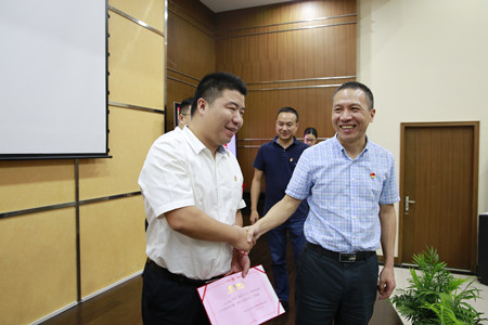 圖為集團(tuán)副董事長(zhǎng)、總經(jīng)理張建平與第一名選手握手