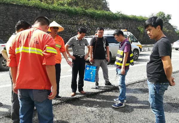 圖為集團(tuán)總工程師江輝與相關(guān)人員在現(xiàn)場(chǎng)協(xié)商病害處置方案 根據(jù)施工方反應(yīng),臨海南匝道段瀝青路面病害較為嚴(yán)重,江輝一行即刻邀請(qǐng)路面專項(xiàng)工程設(shè)計(jì)方共同到現(xiàn)場(chǎng),仔細(xì)檢查瀝青路面病害情況,并根據(jù)病害程度,裂縫、車轍等情況協(xié)商確定相應(yīng)的專項(xiàng)處置方案,以便更好地開(kāi)展路面維修工作。