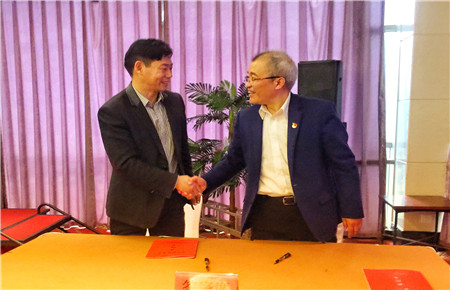 圖為集團副總經(jīng)理陳保衛(wèi)與國資委主任徐豪簽訂責(zé)任書后握手