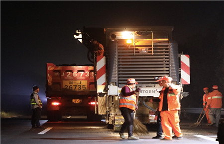 確定日期時(shí)間。施工前夕工程部負(fù)責(zé)人反復(fù)與交警、路政等部門溝通協(xié)調(diào),渠道暢通,最終達(dá)成一致意見,為盡量避免給公眾出行帶來(lái)影響,施工基本采用夜間斷流封道方式進(jìn)行。施工過(guò)程中與高速交警、路政配合默契,封道都在規(guī)定時(shí)間內(nèi)開始結(jié)束,盡所能減輕施工對(duì)高速營(yíng)運(yùn)影響,保證路段通行能力。