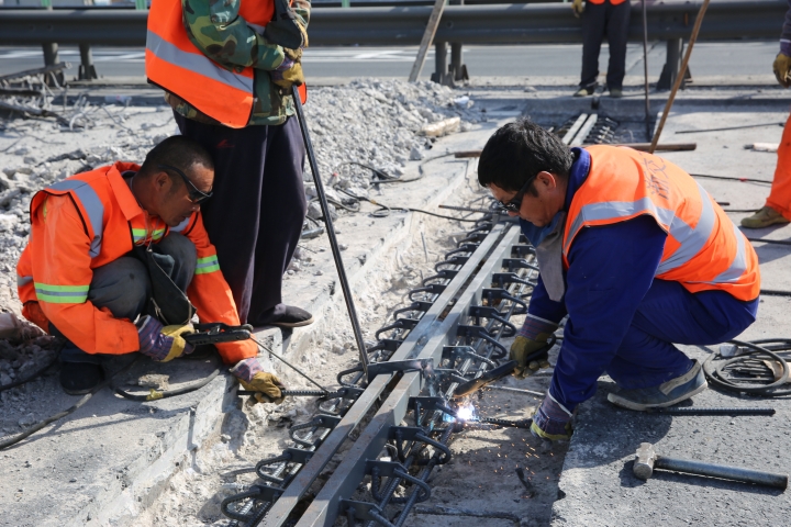 隨后,在伸縮縫型鋼安裝現(xiàn)場,陳文波撿起鑿除的碎渣,查看被鑿除的舊伸縮縫情況。公司所轄路段屬于軟土路基,且有91座橋梁,由于運(yùn)行時間已20余年,部分橋梁伸縮縫破損較為嚴(yán)重,如何維修橋梁伸縮縫和橋頭跳一直是個老大難問題。在橋梁伸縮縫修補(bǔ)現(xiàn)場,因?yàn)橹剀嚨哪雺海糠稚炜s縫已經(jīng)磨損嚴(yán)重,所在的混凝土路面只能借助鑿巖機(jī)進(jìn)行作業(yè)。