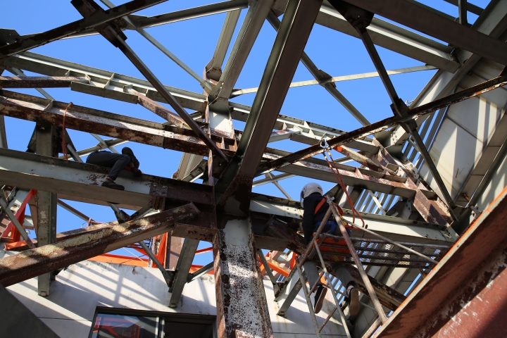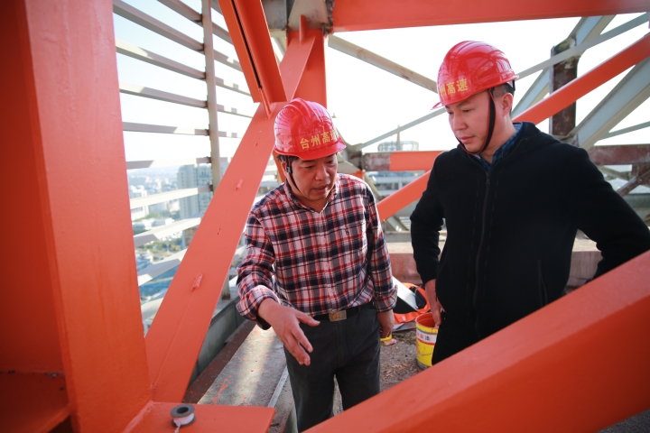 集團安全總監(jiān)項同富檢查天和大廈除銹施工 11月15日下午,集團安全總監(jiān)項同富在辦公室、房產(chǎn)公司相關(guān)人員的陪同下,到天和大廈樓頂鋼架除銹施工現(xiàn)場檢查施工進展和安全工作。 集團總部天和大廈樓頂鋼架跨度大,高低水平不一致,很難搭建大范圍的防護網(wǎng)及腳手架等施工輔助工具,也無法采用大型機械打磨除銹的方式除去表面的銹層,只能靠手工和電動角磨機除銹。施工人員常常進行高空作業(yè),安全隱患大。