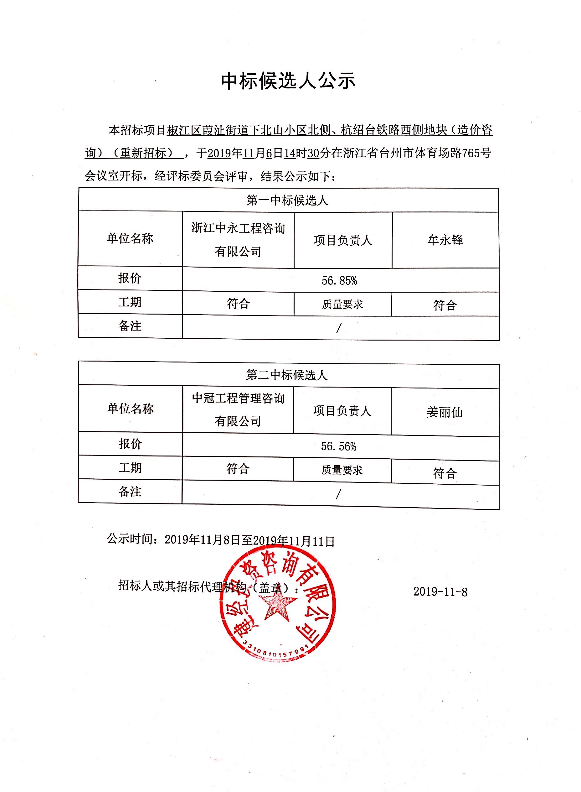 椒江區(qū)葭沚街道下北山小區(qū)北側(cè)、杭紹臺鐵路西側(cè)地塊(造價咨詢)中標候選人公示