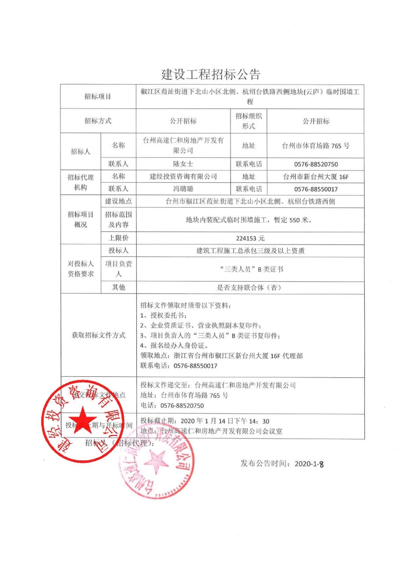 椒江區(qū)葭沚街道下北山小區(qū)北側(cè)、杭紹臺(tái)鐵路西側(cè)地塊(云廬)臨時(shí)圍墻工程招標(biāo)公告