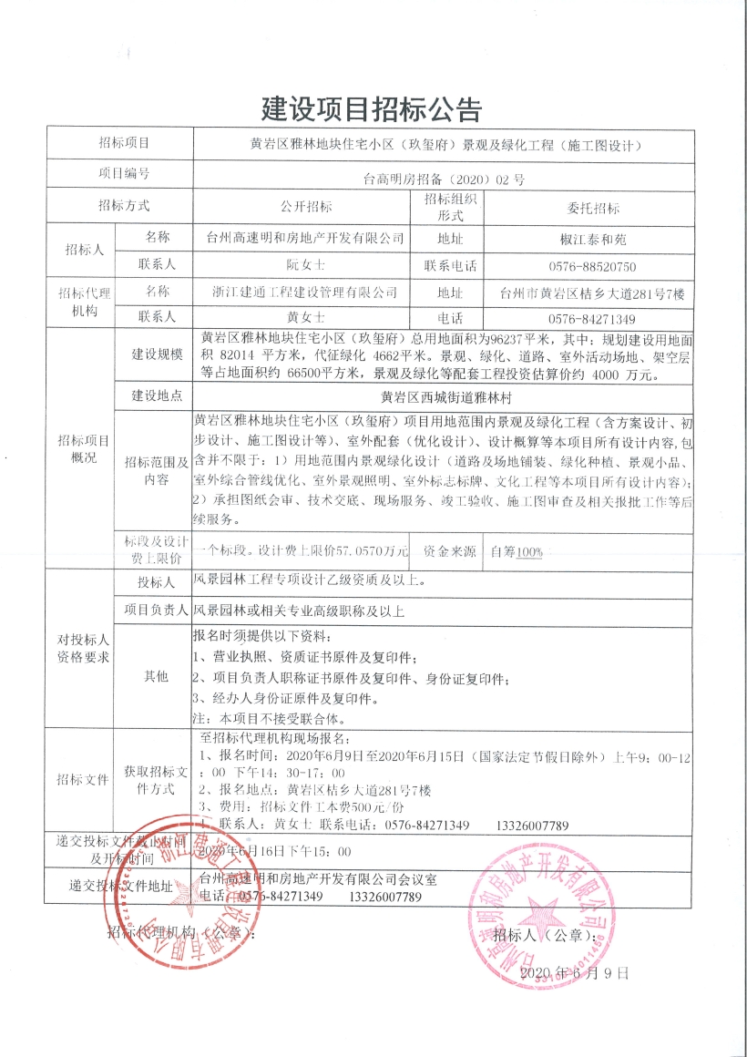 黃巖區(qū)雅林地塊住宅小區(qū)(玖璽府)景觀及綠化工程(施工圖設(shè)計)招標公告
