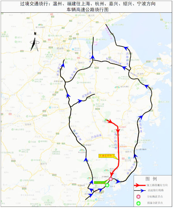 在甬臺溫高速寧波方向南塘樞紐進(jìn)行斷流,所有車輛改走甬莞高速;甬莞高速南塘樞紐轉(zhuǎn)甬臺溫高速寧波方向匝道關(guān)閉;臺金高速水洋樞紐轉(zhuǎn)甬臺溫高速寧波方向匝道關(guān)閉;甬臺溫高速溫州方向吳岙樞紐轉(zhuǎn)上三高速上虞方向匝道關(guān)閉;甬臺溫高速溫州方向、上三高速三門方向保持通行,部分路段借用對向車道通行。