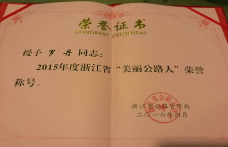 圖為羅丹獲得“美麗公路人”的榮譽證書