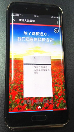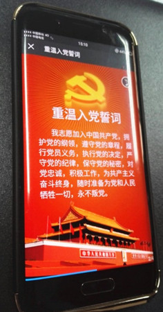 “凝視黨旗,我把奉獻(xiàn)刻心里;舉起右拳,我把責(zé)任刻心里;宣讀誓言見證我對黨的忠誠;這崇高的選擇是我終身的信仰----”點(diǎn)開微信圖文信息,伴隨著低沉渾厚的男聲詩朗誦,接收到信息的黨員們不由肅然起敬,仿佛置身當(dāng)年黨旗下宣誓的莊嚴(yán)時刻。